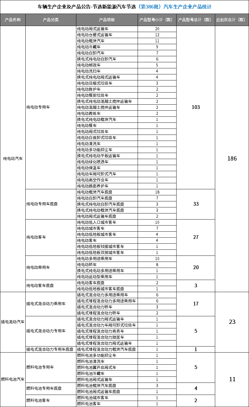 2024年9月19日,工业和信息化部正式公告《道路机动车辆生产企业及产品(第386批)》,依据同一型号判定原则归纳后,通过技术审查的新能源汽车产品共计372个。